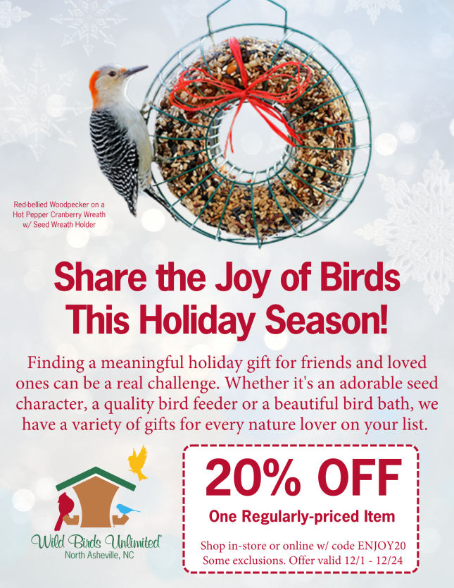 At Wild Birds Unlimited of North Asheville we have the highest quality and freshest bird food on the market, curated specifically for the birds in Western North Carolina, We're your one stop shop for all things related to the hobby of backyard bird feeding. In addition to bird food, we have a wide assortment of bird feeders (including squirrel proof!), mounting hardware, bird baths, garden accessories, nesting boxes, birding books, binoculars, unique nature inspired gifts and so much more! Whether you're a novice and just getting started or are an avid birder, we'll meet you where you're at and our team of experts will help you get the most out of the hobby. We're locally owned and we've been serving the North Asheville and surrounding area for close to 10 years. Stop by and say hi to one of our friendly and self proclaimed "Bird Nerds", get a free sample of seed and see all that is in store. See(d) you soon!
