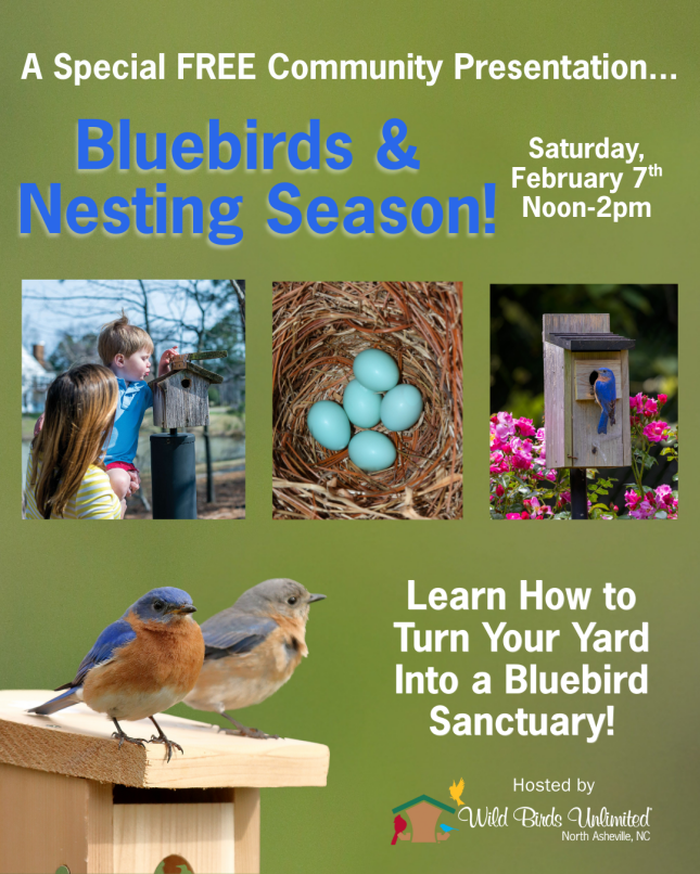 Join us as we welcome back Ron Brenneman to the store to talk about the magic of Bluebirds and nesting season. Ron has an extensive background in all things Bluebirds and is a Certified Wildlife Biologist. He is co-founder of the South Carolina Bluebird Society (SCBS), an affiliate of the North American Bluebird Society and serves on its Board of Directors. Ron will teach you how to create a Bluebird sanctuary in your own backyard and get you geared up for nesting season. Bring your questions and be prepared to learn and have fun. This is a great event for the whole family! This is a FREE event and open to the community, no registration is required. If you do not wish to stand, please bring a folding chair. Please call the store if you have any questions, (828) 575-2081.